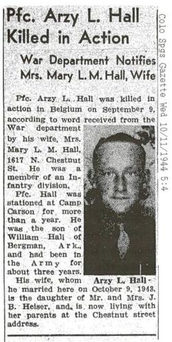 Pfc. Arzy L. Hall Killed in Action War Department Notifies Mrs. Mary L. M. Hall, Wife Pfc. Arzy L.Hall was killed in action in Belgium on September 9, according to word received from the War Department by his wife Mrs. Mary L. M. Hall 1617 N.Chestnut St. He was a member of an infantry division. Pfc. Hall was stationed at Camp Carson for more than a year. He was the son of William Hall of Bergman, Ark. And had been in the Army for about three years. His wife, whom Arzy L. Hall he married here on October 9, 1943, is the daughter of Mr. and Mrs. J. B. Heiser, and, is now living with her parents at the Chestnut street address
