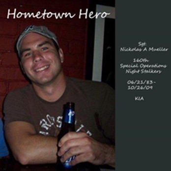 Nick was a mission qualified MH-47G Crew Chief on a Chinook Helicopter flying over 412 combat flight hours. Nick was the assistant training NCO. “For he loved to fight, fought to win, and would rather die than quit.” NSDQ On October 26th, 2009, Nick did pay the ultimate sacrifice in a helicopter crash while on active duty in the Badghis Province of Northwestern Afghanistan. Nick’s goal in the army was to be a pilot. As a young child in grade school, Nick talked about being a pilot in the army. Nick was living towards that dream. He loved the military. He was supporting our country and loving it. Nick was making a difference. He was strong, intelligent, and achieved everything he went after. He always carried a big smile and cared for people. Nick was loved by many and liked by all. He had many friends, wrestled, played basketball and football, participated in track, played the bari sax in pep and jazz band, and was in choir and drama. Nick was elected 2001 Homecoming King. Here are the awards and medals that Nick received: Sergeant Mueller's awards include the Army Good Conduct Medal, the National Defense Service Medal, the Korean Defense Service Medal, Global War on Terrorism Service Medal, the Noncommissioned Officer Professional Development Ribbon, the Army Service Ribbon, the Overseas Service Ribbon, the Combat Action Badge, the Basic Aviation Badge and the Air Medal. He was posthumously awarded the Bronze Star Medal, the Purple Heart, the Meritorious Service Medal, and the Air Medal.